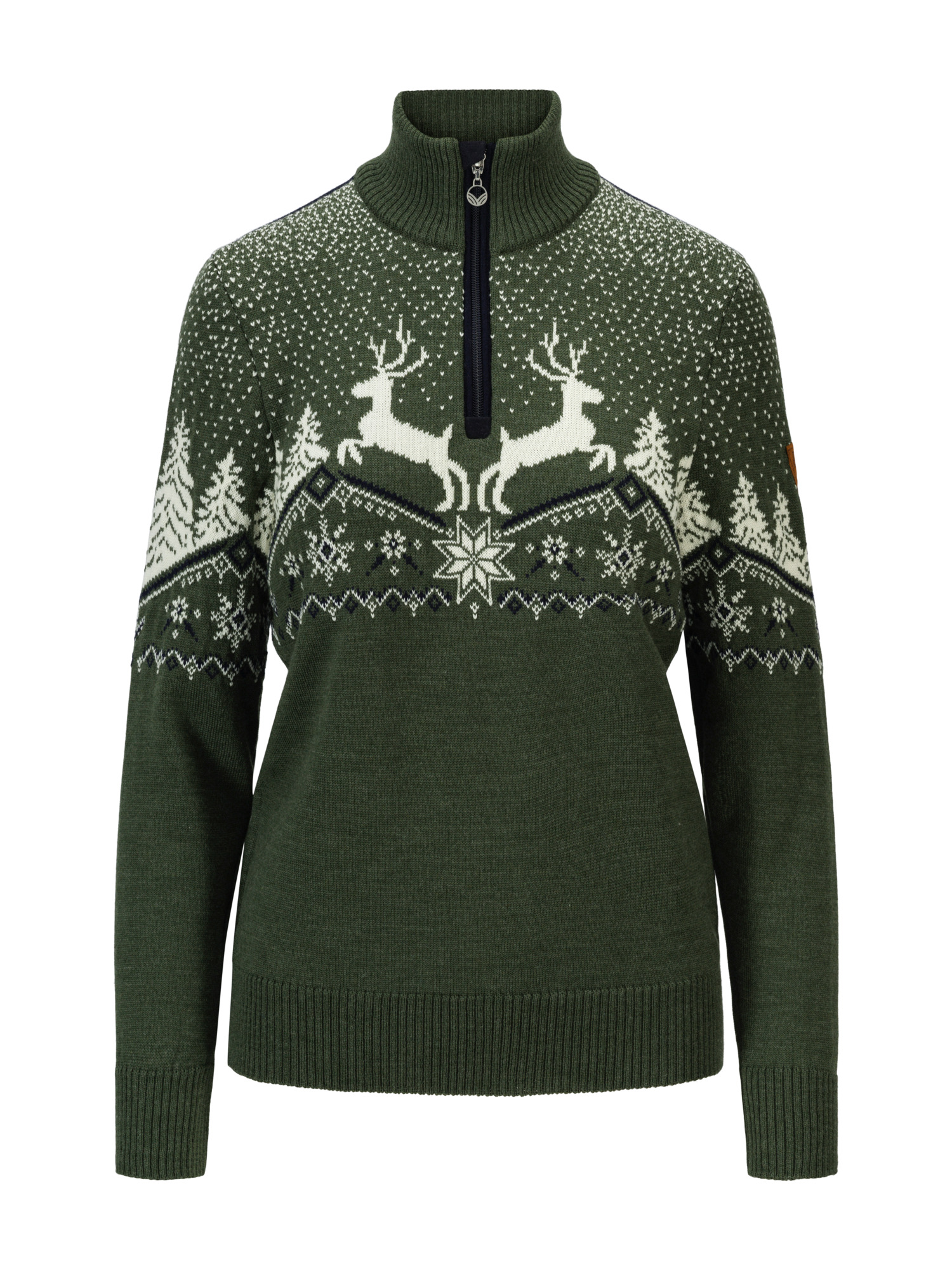 A stylish and classic Christmas merino wool sweater capturing the spirit of an authentic Norwegian winter. Featuring reindeer, Christmas trees, falling snow, and at its heart, the traditional eight-petal rose — a signature of Norwegian knit design.