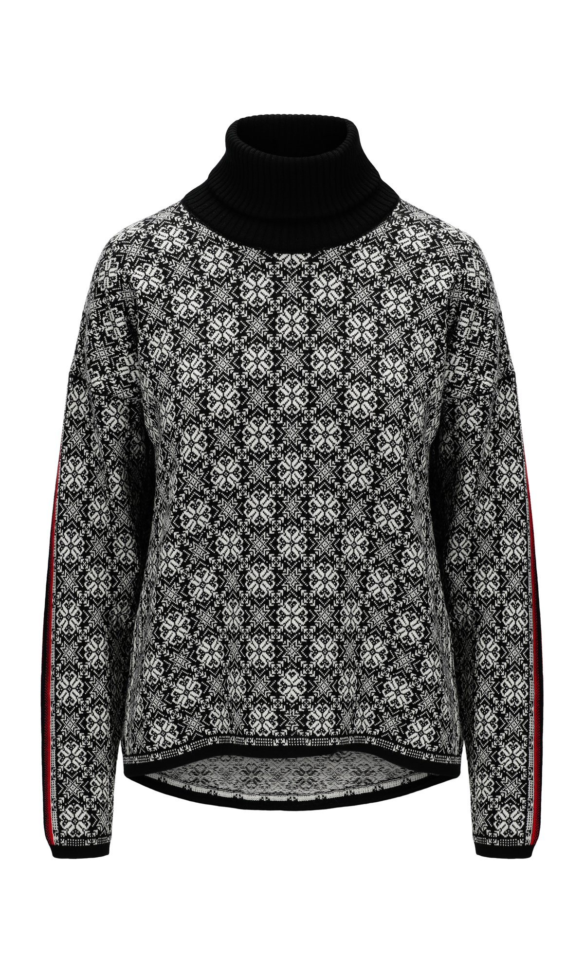 • This is a relaxed turtleneck sweater with a young and wide fit, with shorter front and slightly longer back. The pattern features a softened, round-edged version of the eight-petal rose repeated across the sweater.